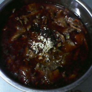 将蒜切碎放在汤上,将花椒炸熟撵碎放汤上,将干料放汤上。锅里放肆汤勺油烧热泼在干料上,即成。