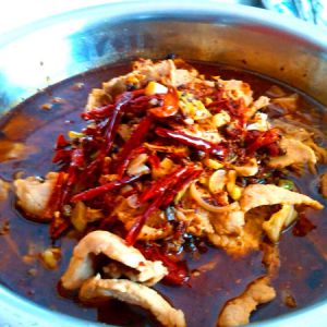热底油,放入葱花,蒜,花椒,川椒,麻椒(均少量)翻炒几下加入四川豆瓣酱,然后放肉,翻炒均匀后加水适量(按容器的容量自己衡量),然后加入盐,和适量的糖调味(糖的作用是让味道过度,以咸为主),满意后出锅,整锅浇在容器的菜上面,这样水煮肉片的雏形就出来了