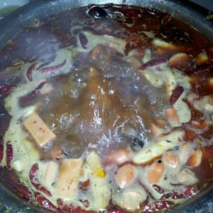 油烧至八成熟放入干辣椒花椒,火锅料炒香,放入料酒,再放入冷水,烧开后让它多开会,倒入肉片,放入盐,鸡精