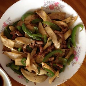 锅中添加一些油 下茭白翻炒一会儿再加入青椒 炒至熟 再倒入已经熟了的肉丝 一起翻炒 若太干可加少许水防止焦或者粘锅