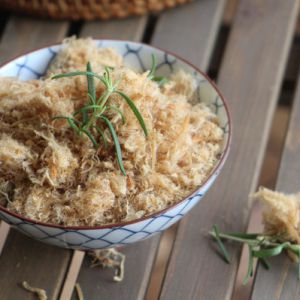 烤箱预热170度,打散的肉松倒到学厨不沾烤盘中,放到预热好的烤箱里,烤5分钟取出肉松翻面一次,再继续烤5分钟
