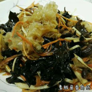 把泡发的香菇、木耳、银耳、胡萝卜、茭白切丝