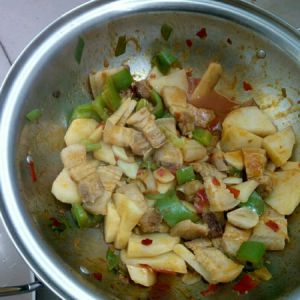 将锅内剩下的油继续烧热放入豆瓣酱炒香后 下切好的葱青红椒和大蒜 翻炒均匀后加少量的水 待水滚起来后下肉 再加少量的水翻炒 加糖 收汁即可
