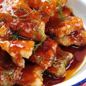 将调好的糖醋汁迅速淋在炸好的鱼片上即可。