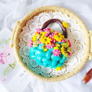 叶子用青汁粉调色,牙签压出纹路,篮子的把手用了可可粉调色的