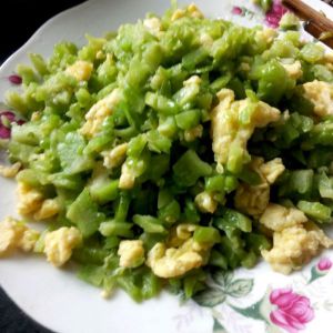 将鸡蛋煎炒至五分熟,加入苦瓜,起锅。