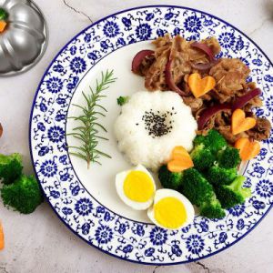 米饭倒扣在盘子里,然后拿走南瓜模具,用西蓝花,胡萝卜,黑芝麻装饰一下