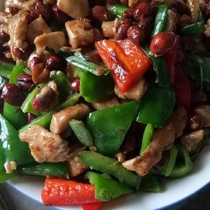 锅里放油,烧热放入姜葱蒜花椒辣椒爆香。放入鸡胸进行爆炒,放点酱油,盐,鸡精,进行翻炒。加入青红椒翻炒出锅前加入之前的花生米翻炒即可出锅!香喷喷的农家辣子鸡就做好啦!