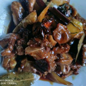 放入鸭肉,翻炒均匀,放入生抽,老抽,蚝油,料酒,中火闷30分钟。