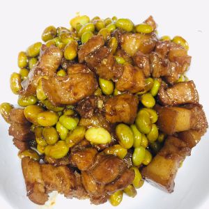 毛豆剥粒 五花肉切小块,五花肉焯水 煸炒出油 煸炒差不多了放入香料 ,接着将冰糖炒化
