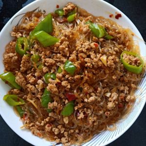 水快干时翻炒收汁 加青红椒和鸡精 拌匀起锅