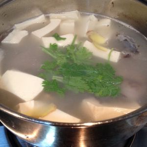 加入豆腐,等汤再浓白些。加入适量盐,白胡椒粉,撒入香菜,出锅!