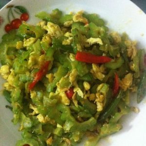 在锅里放少许油 倒入已搅拌好的蛋 翻炒几下 关火 然后把蛋盛出 再放油 将苦瓜倒进炒 感觉差不多熟了的时候把鸡蛋倒进去 放少许盐 炒3分钟左右就可以盛起来了。(开始用盐水泡的时候苦瓜已经有盐了 因为经过几次洗了之后怕淡 所以得加点盐 喜欢吃辣椒的 可以炒苦瓜的时候就放辣椒)