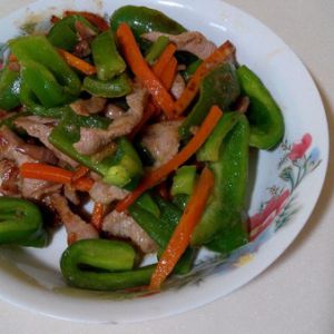 肉变色,下青椒翻炒片刻,同时可以起锅前调味。盐少许,鸡精(白糖可代替)少许。起锅。