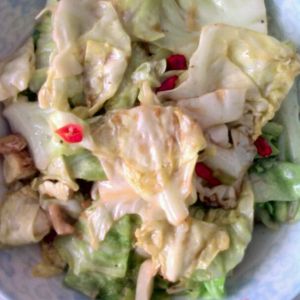 将配料炒香后放入包菜,赶紧放白糖,(可根据个人口味适量增减),翻炒几下放醋,盐,鸡精出锅