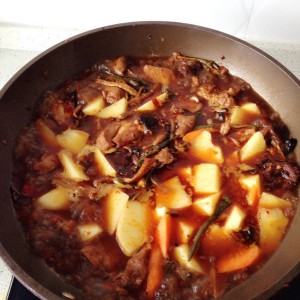 排骨炒的有点干了倒入清水莫过排骨炖煮,然后添加菌菇干菜类,排骨6分熟倒入土豆萝卜,等土豆熟了放点牛肉粉翻炒出锅