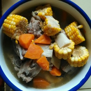 捞出排骨来用水冲冲,玉米切段、胡罗卜切滚刀块。
