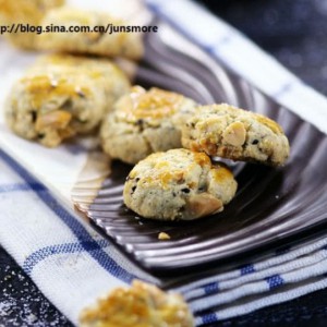 生花生烤熟或炒熟以后,去除红衣,用料理机稍稍打碎(不要打得太碎)。黑芝麻烤熟或炒熟以后,用料理机打碎成粉状。