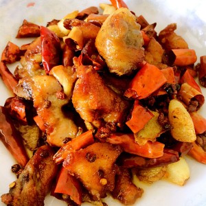 将煎好的鸡腿肉装盘,锅里留底油,将花椒,红辣椒,姜蒜煸炒出香味,再倒入煎好的鸡块翻炒均匀即可。