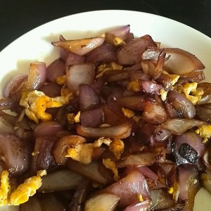 把洋葱炒熟并放入盐,然后再把鸡蛋放进去翻炒出锅,即食