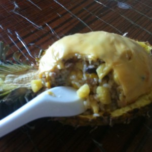 将所有食材连同米饭放入锅里一起炒,先放鸡蛋和肉馅,菠萝最后放,其它食材都熟了在放菠萝,翻炒出锅,炒久了会烂。然后装在挖好的菠萝壳子里。