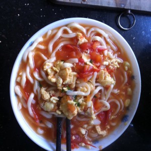 把炒好的鸡蛋放入锅内和西红柿翻炒,加入一勺水,静等十分钟。