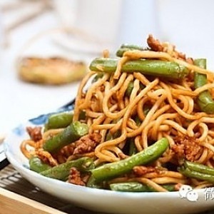 先把蒜爆香,肉煸炒熟,放入八角,倒入酱油,料酒,糖,然后放入扁豆煸炒到半熟。倒入开水,水面要没过扁豆