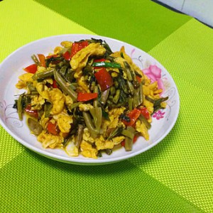 香椿泡开后拧干水分切段,鸡蛋打入碗内加3m清水炒一个方向充分搅拌。葱切段,生姜切片,红椒切小块待用。