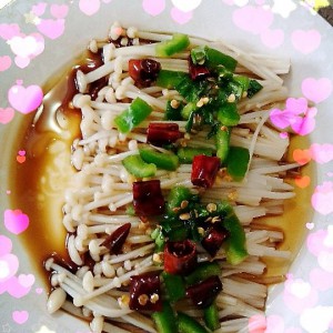 趁热将爆香的油均匀的浇在金针菇上,哇~~夏日里清凉爽口的凉拌金针菇妥了!