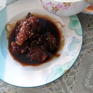 将炸好的排骨放入酱料中拌匀盛盘撒上白芝麻完成