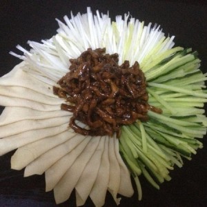 里脊肉、大葱1根、黄瓜1根切丝,千张用开水焯一下,过冷水切成四方块待用。
