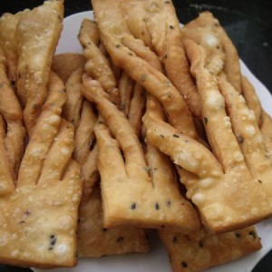 把对折的面皮展开,从切开的缝隙中对折翻转,就翻成这样的麻花形状了。