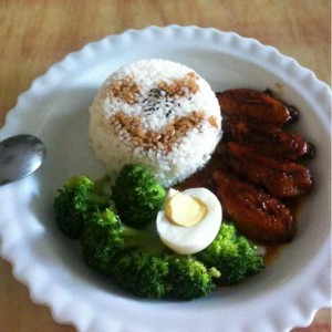 最后就是用小碗盛米饭,压下再倒扣入盘中。可以淋些鸡翅的汤汁上去,将刚才的鸡翅和西兰花摆盘。