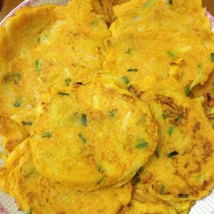 把土豆丝,萝卜丝,葱花放入蛋浆搅拌