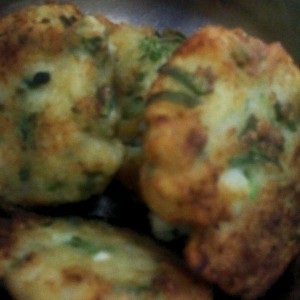 韭菜切碎,放在放有土豆泥的碗中再加上盐,面粉。然后搅拌,搅拌好后弄成小圆饼,放在锅里煎!(图片是已经完全做好的,由于火有点大所以有的焦)