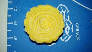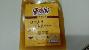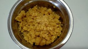 取约35克绿豆粉及10克栗子蓉,绿豆粉搓成圆球后再压成圆饼形,将栗子蓉做馅儿包在绿豆饼里