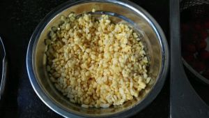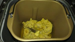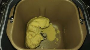 和面完成后加入黄油、炼乳及白砂糖,再选面包机果酱程序