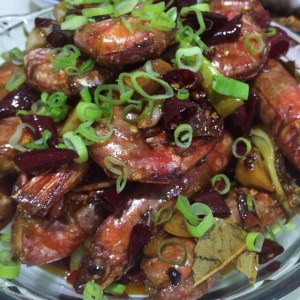 锅里加适量油,将腌渍好的大虾放进去煸炒,顺便放两三段葱