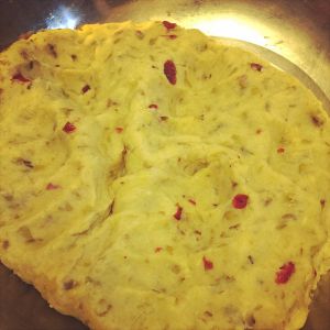 出锅的绿豆用平铲压成泥,也可以是料理机。然后锅里下黄油,加入豆泥,炼乳,麦芽糖,白糖翻炒,收火加切碎的蔓越梅翻炒均匀,出锅。