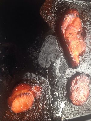 将烤箱盘放入烤箱中,调回180度。烤15分钟后拿出来翻面,再涂一层蜂蜜,放入烤箱再烤15分钟