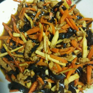 少油起锅,放姜蒜炒香,加肉丝,翻炒后加入笋丝,萝卜丝,木耳丝。翻炒后加入调好的汁,炒匀,收汁出锅。