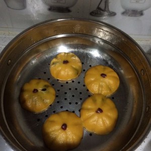 南瓜压成泥,加入糯米粉,揉光,喜甜可再加些白糖,搓成团,中间挖个洞,加入拌好的芝麻糖,搓圆,放到蒸锅里,用勺子柄压好条纹,将红枣剪成小块放到顶部,锅内加水,蒸15分钟,即可。