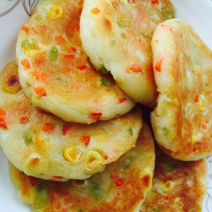 材料全部搅拌均匀,搓成圆饼放入煎锅;直到两面变黄捞出