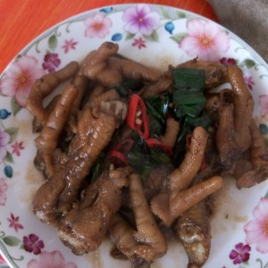热锅放油,放辣椒。蒜苗,放鸡爪。后放酱油,翻炒。颜色均匀可盛出。