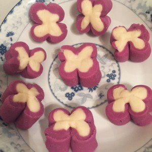 把刚才的剩下的三个紫色面团揉一起,用擀面杖擀扁成圆形,然后把白色面团包进去。弄成长条。切块