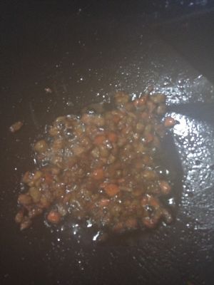 锅中入油先把鲜肉放入锅中煎,随后放入生抽,翻炒一下下,放入腊肠和胡萝卜丁继续翻炒,我放了点五香粉,因为腊肠也有咸味,所以我就不放盐了。好了之后关火。