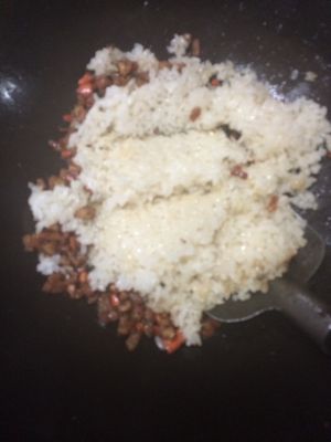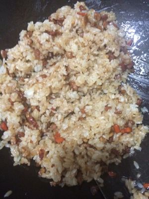 放入糯米饭,再放点生抽,搅拌搅拌使得颜色均匀。