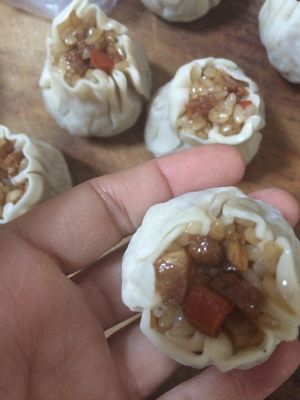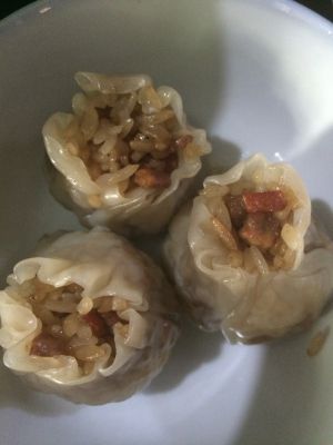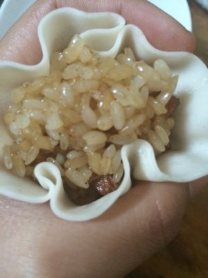 把糯米饭放入馄饨皮中,我喜欢塞得满满的,慢慢捏紧。