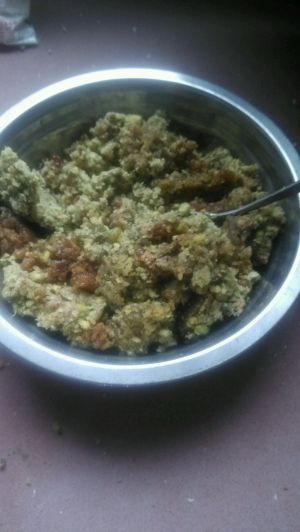 这是我打好的馅料。由绿豆红枣红糖放入搅拌机打烂掺和在一起的。。。本来想用红多的可是商店没得卖只好用绿豆代替,不过味道不错大家可以试一试