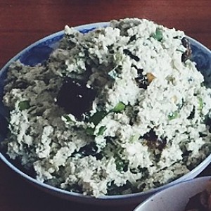 刚才把手洗干净了吧,下手抓,把松花蛋和豆腐葱花抓碎,抓匀。就OK